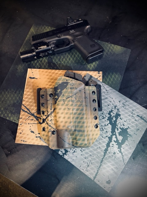 The Glock - light Bearing - OWB Holster and Double Magazine Carrier is a top of the line combination for all your carrying needs. Designed for maximum efficiency and comfort, our product ensures easy access to your firearm and extra magazine. Keep yourself prepared and safe at all times.