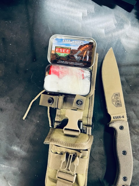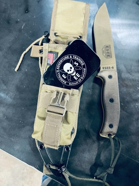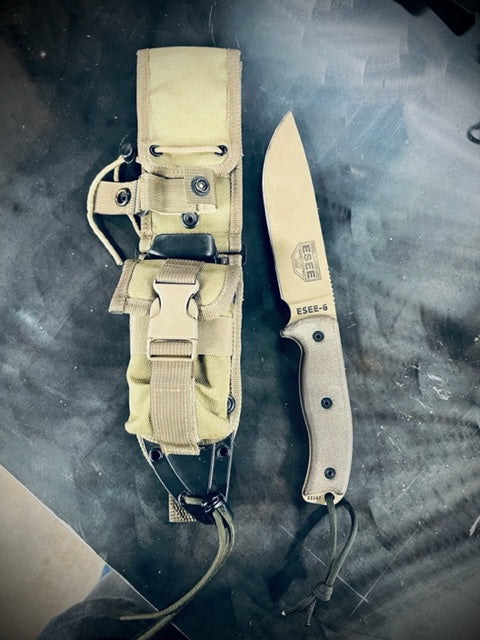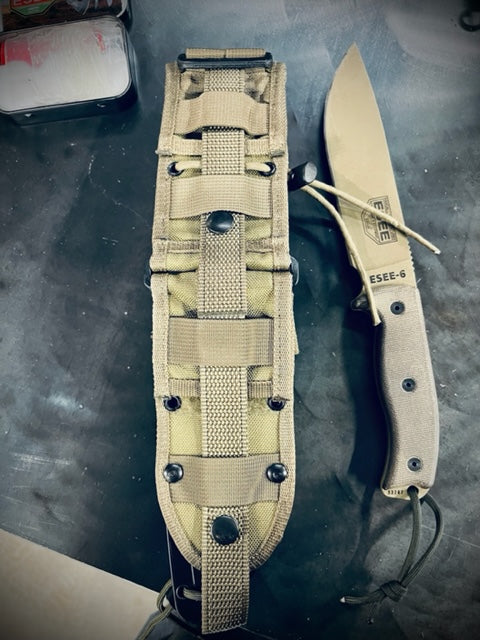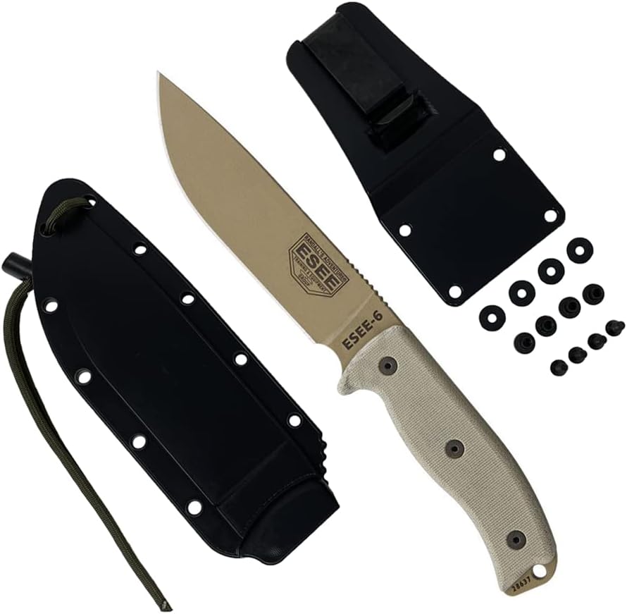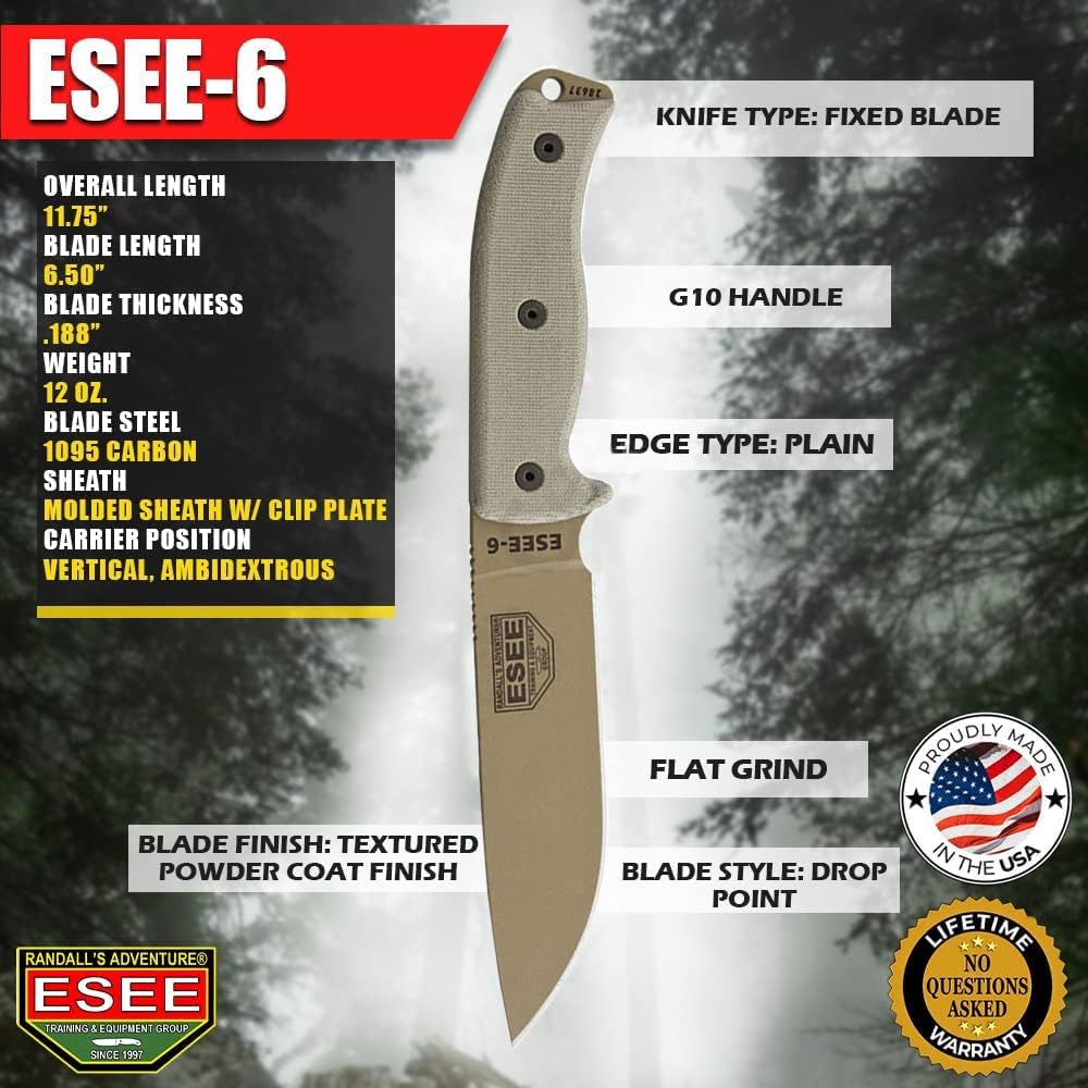 11.75" overall. 5.75" powder coated 1095HC steel drop point blade. Linen micarta handle. Lanyard hole. Full, extended tang. Black molded plastic sheath with clip plate attachment. Molle Back Khaki sheath attachment and survival Tin kit.