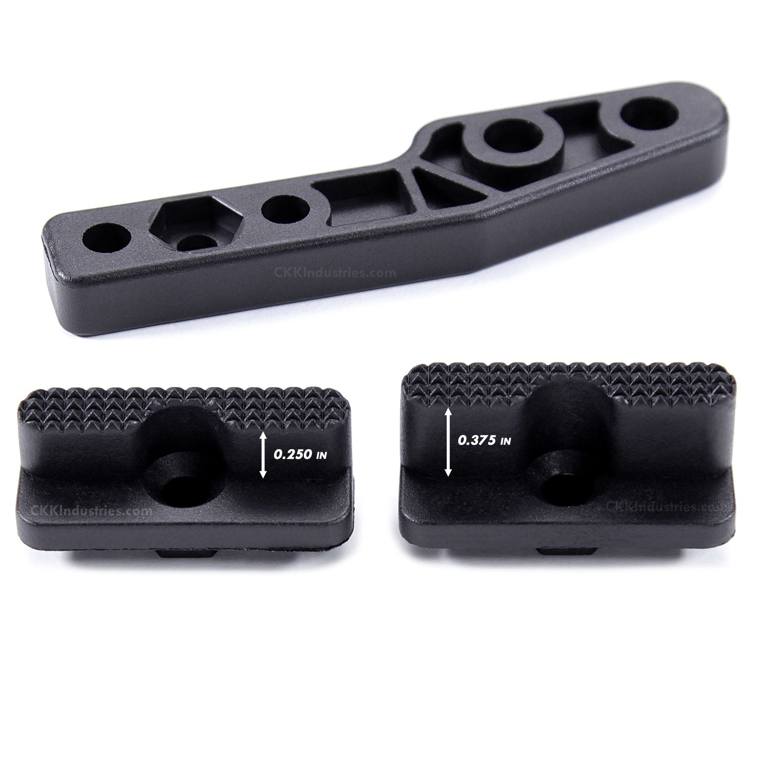 Each ModWing kit comes complete with a Spine, 2 Interchangeable Riser Inserts, and Assembly Hardware. Due to the inserts being interchangeable, and the reversible spine, the ModWing is ambidextrous and can be configured for RH or LH carry. This feature allows the thermoformer to limit their inventory while having to only keep a single item in stock.