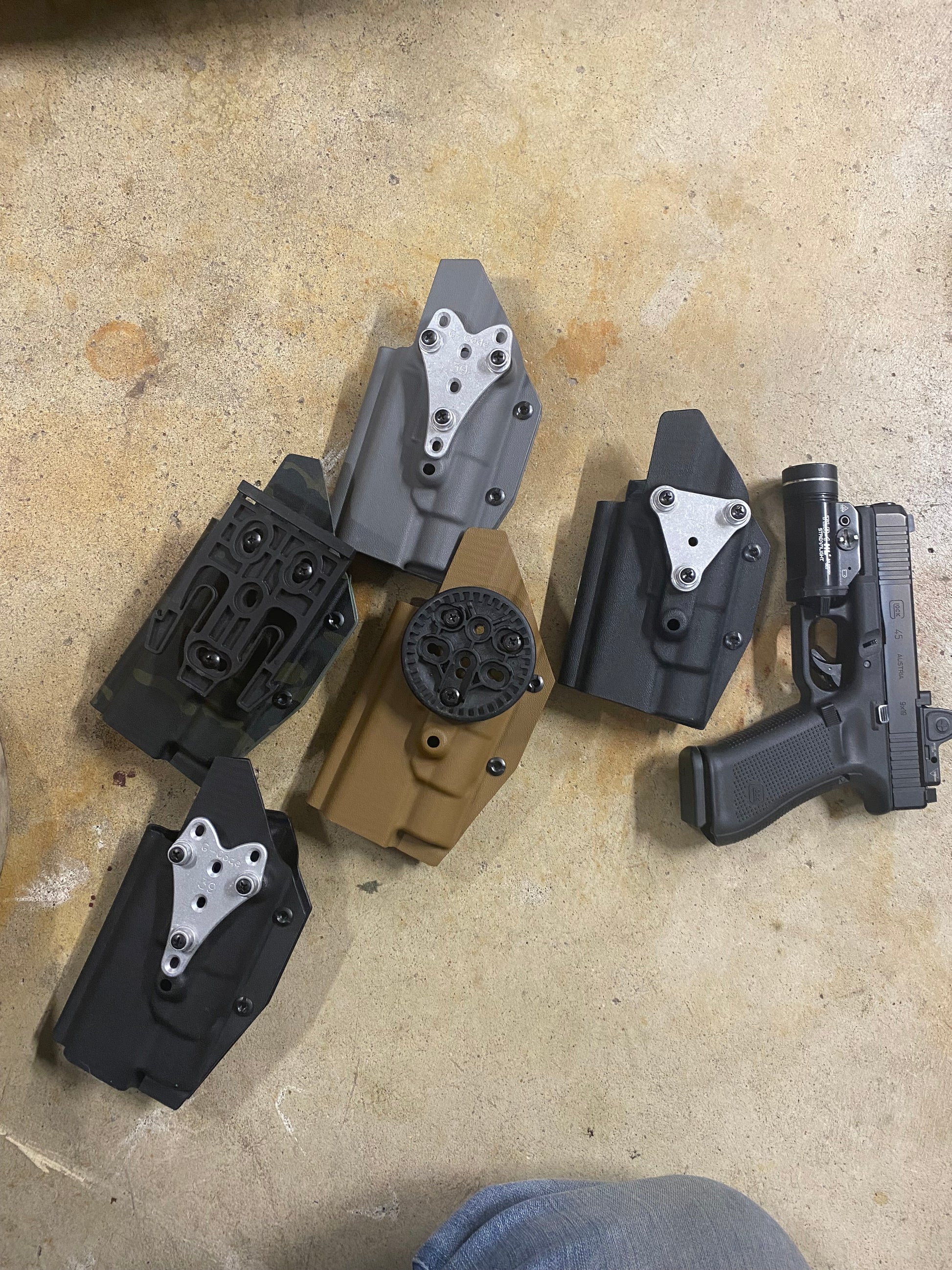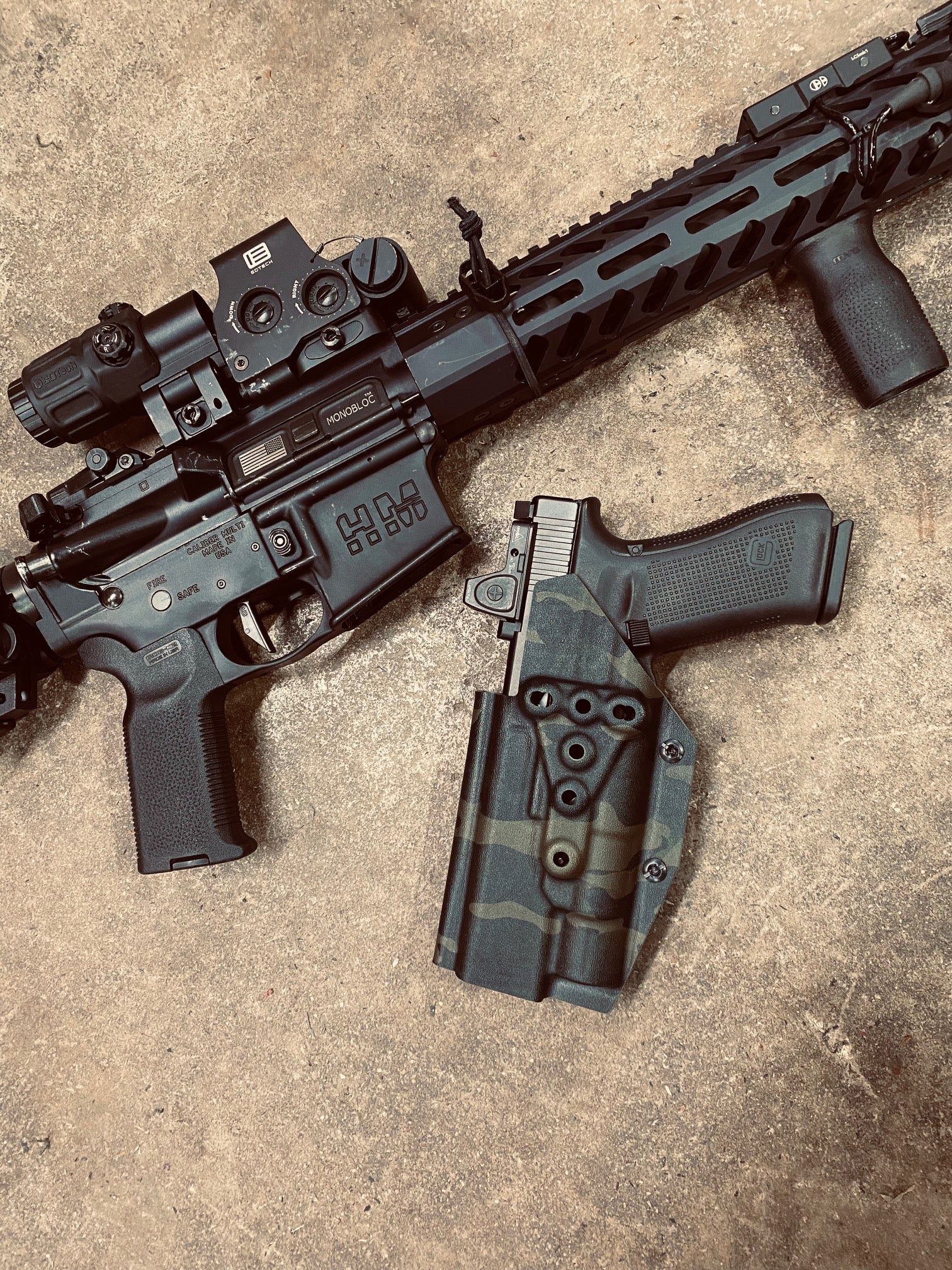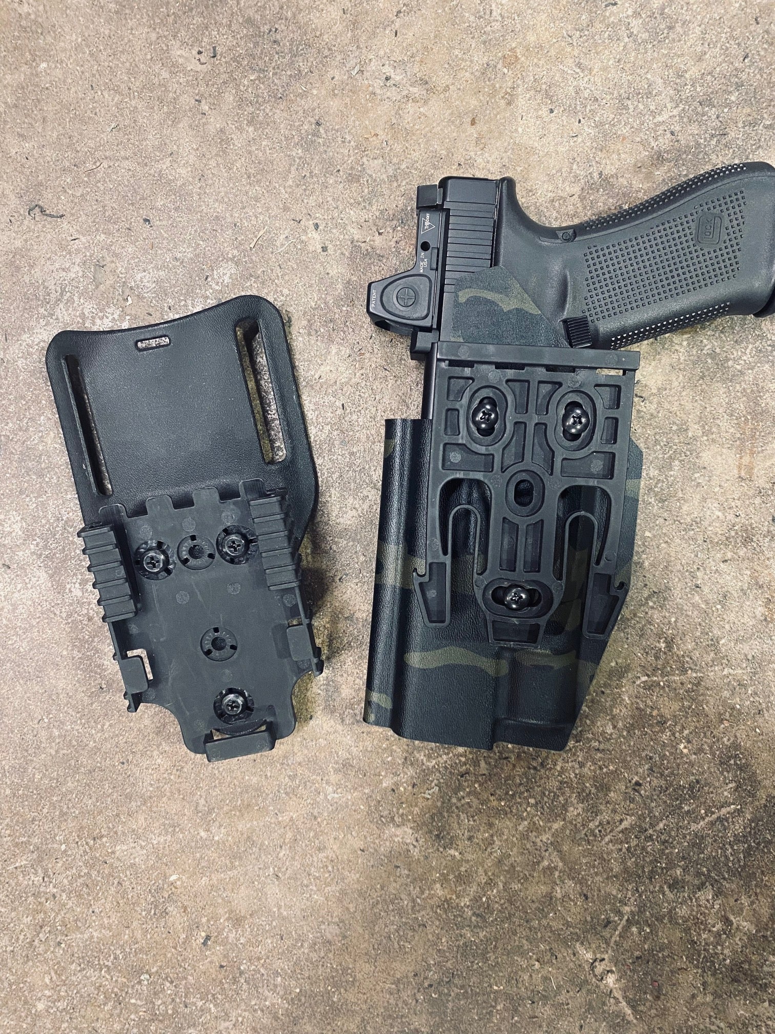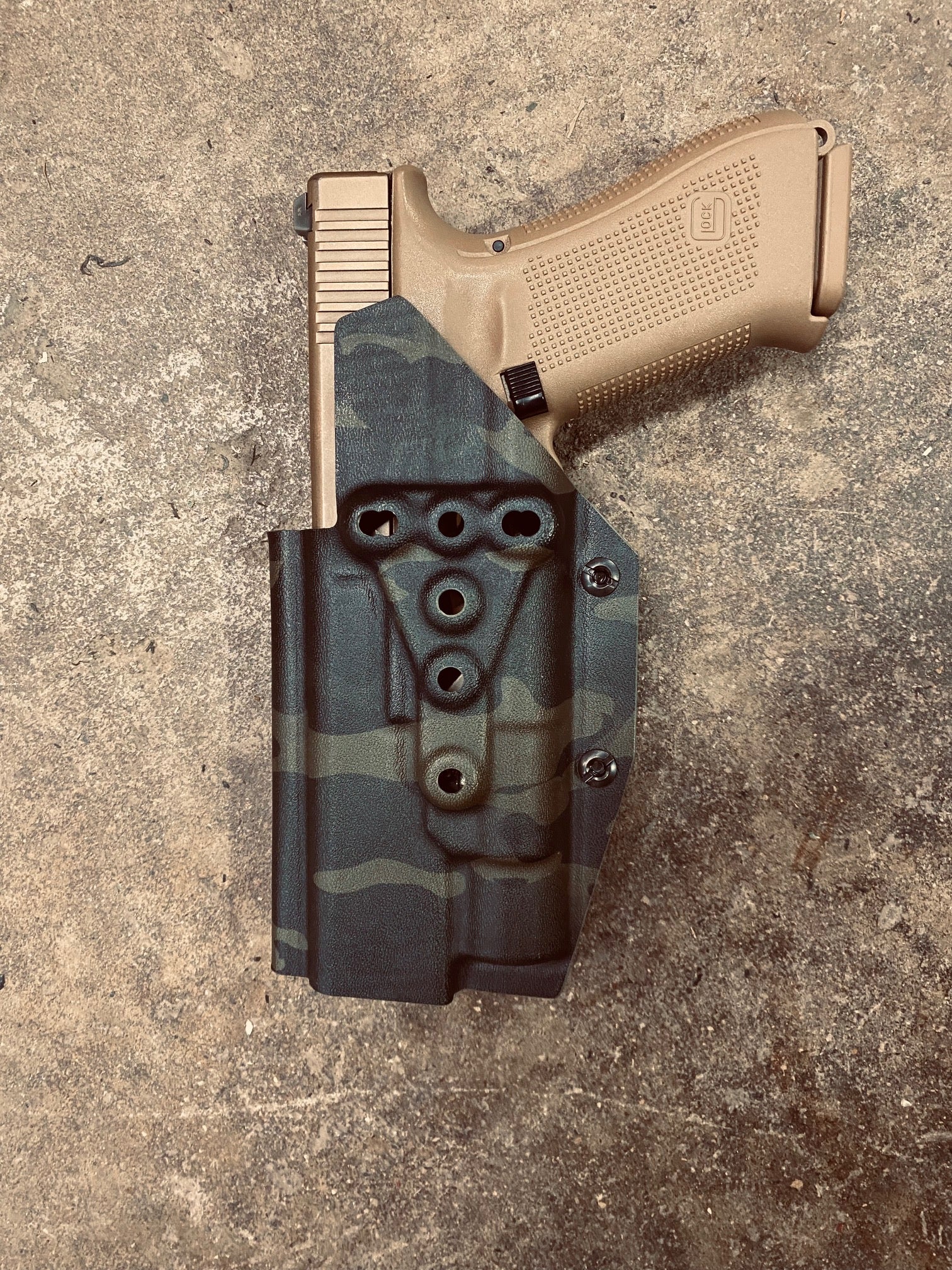 What makes the Sentinel 1 unique is the modular hole pattern on the back that accommodates a variety of mounting options from Safariland, G-Code, Blackhawk, Blade-Tech, S&S Precision, and more. It can be used for competition/range/duty use with paddles, offset mounts, or leg rigs.