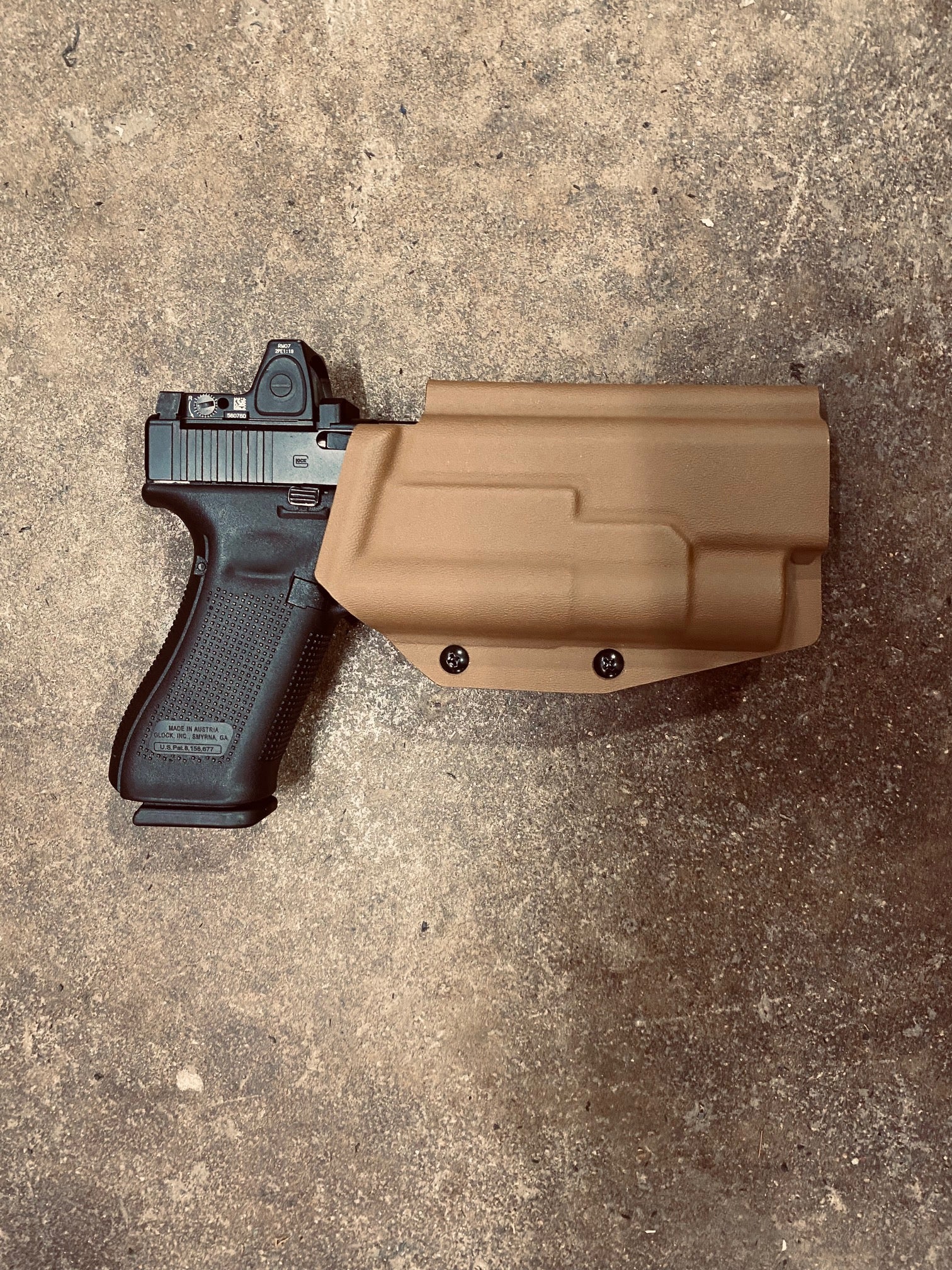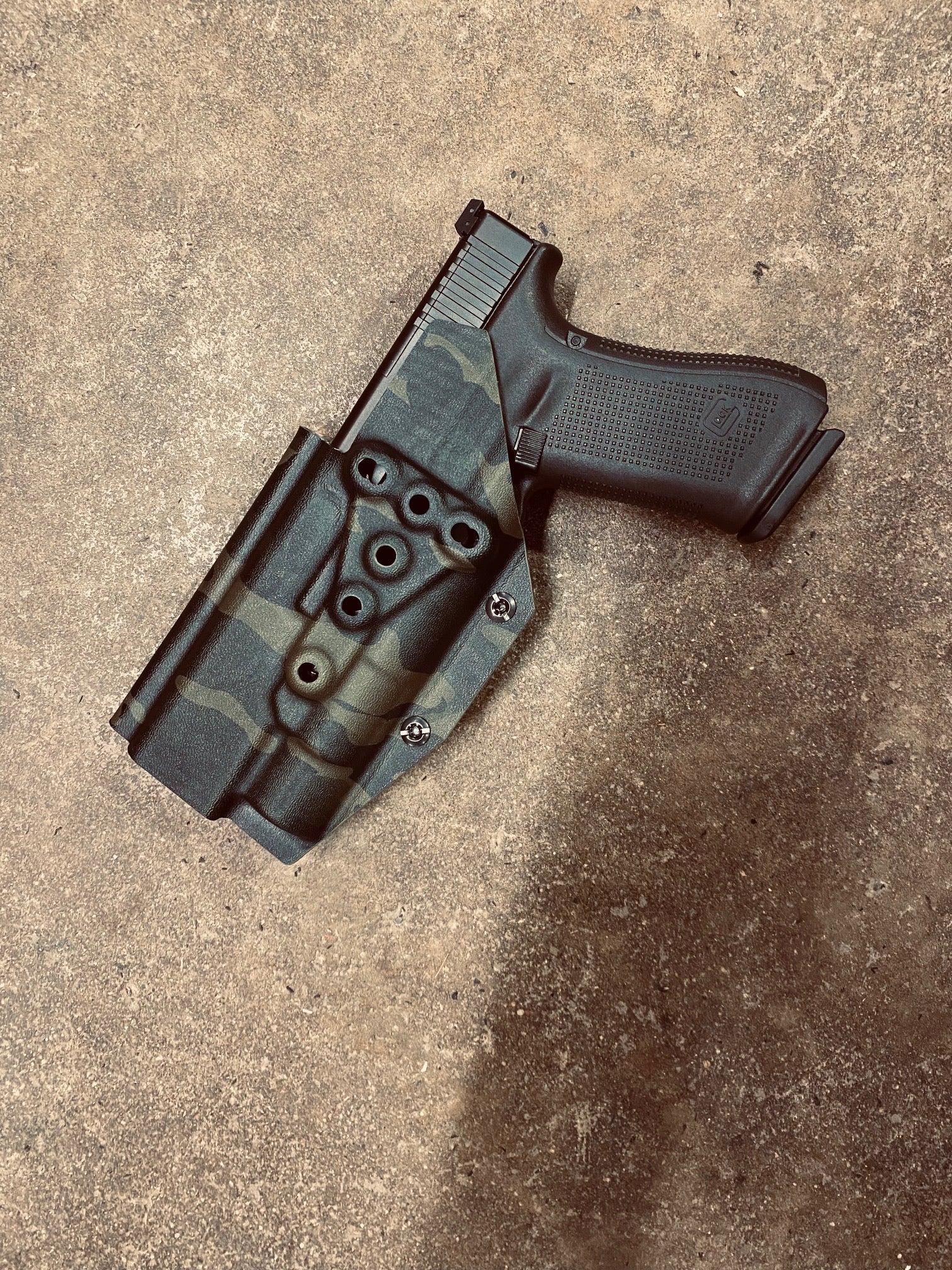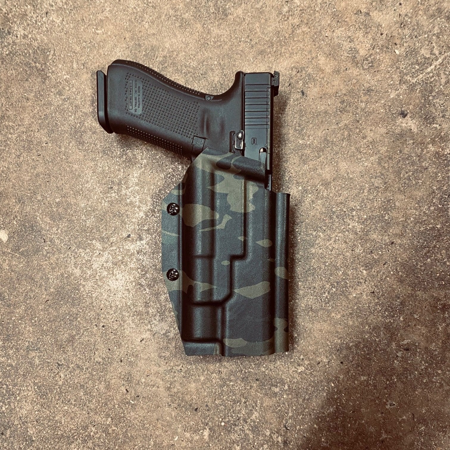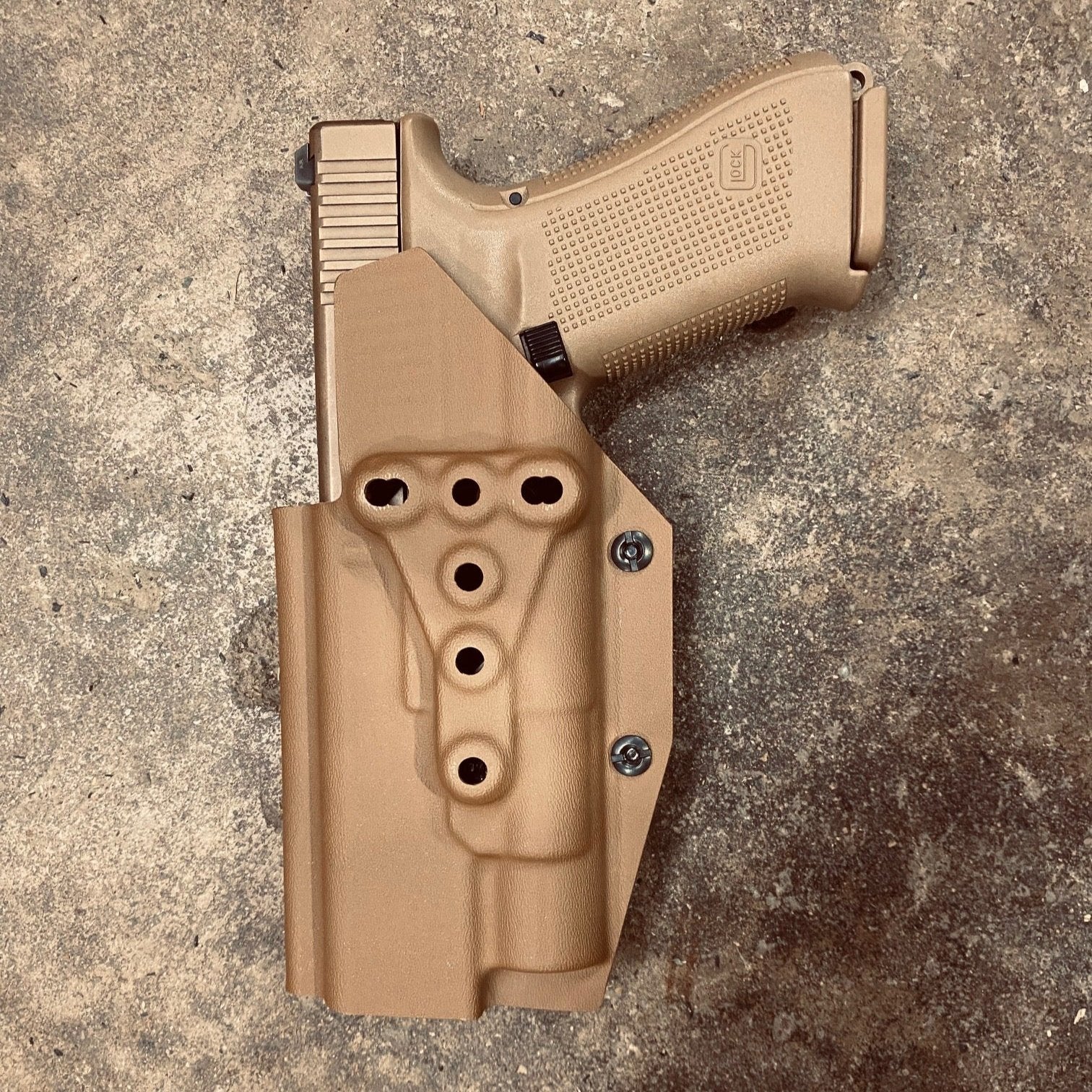 The Sentinel 1 OWB (outside-the-waistband) holster was designed to be extremely modular, tough, modern. Made from a range of kydex .080 - 0.93 or heavy-duty .125 precision-formed Kydex . The Sentinel 1 is a passive-retention holster (no hood/strap/button to deactivate the holster), it features adjustable retention using screws along the edge of the holster. While not necessary for maintaining retention, all Sentinel 1 holsters can accommodate slide mounted optics, threaded barrels, suppressor height sights < .500″, and select compensators.
