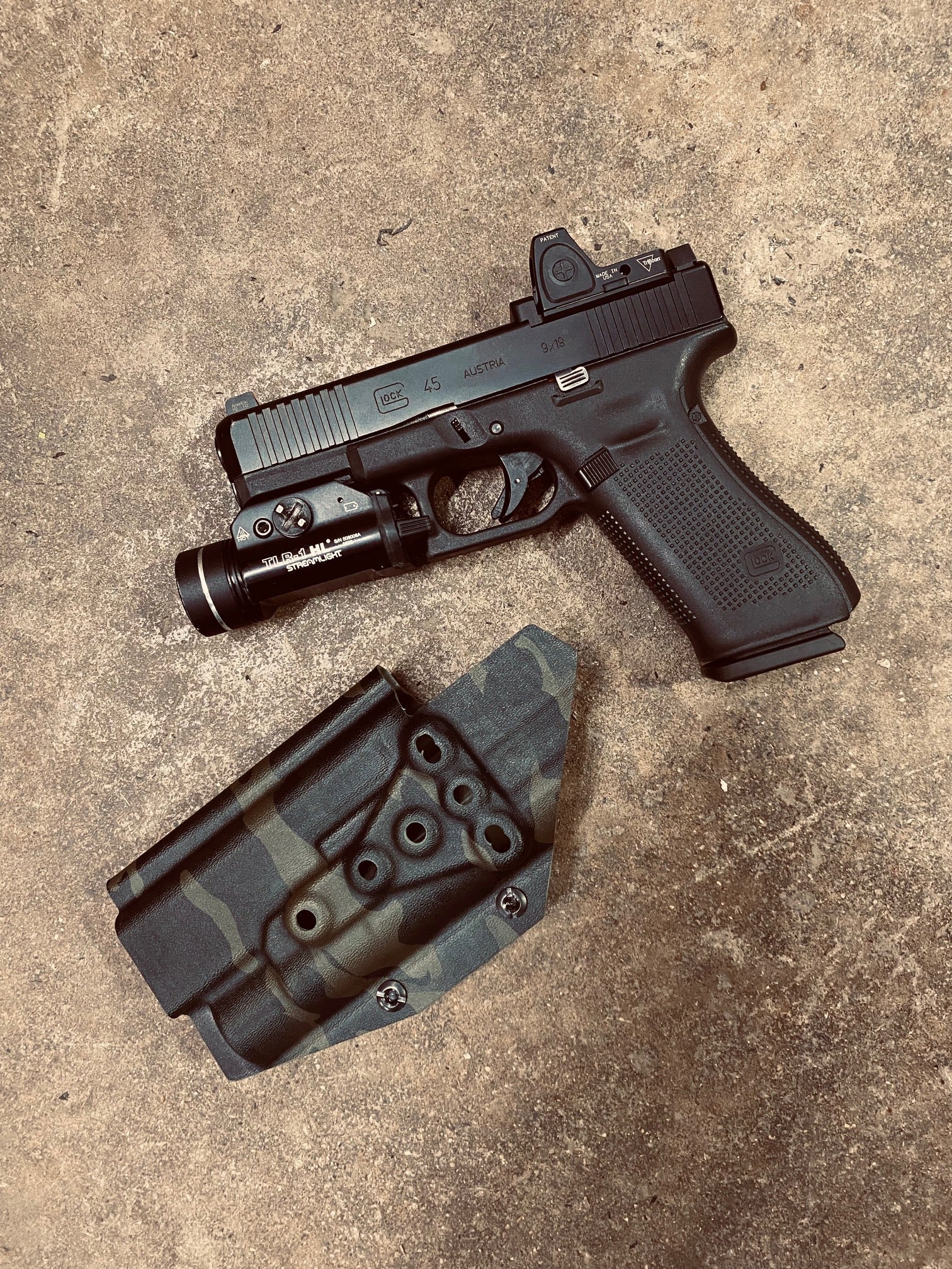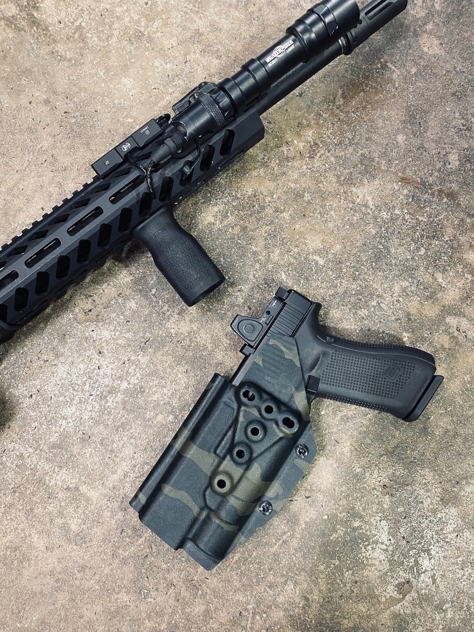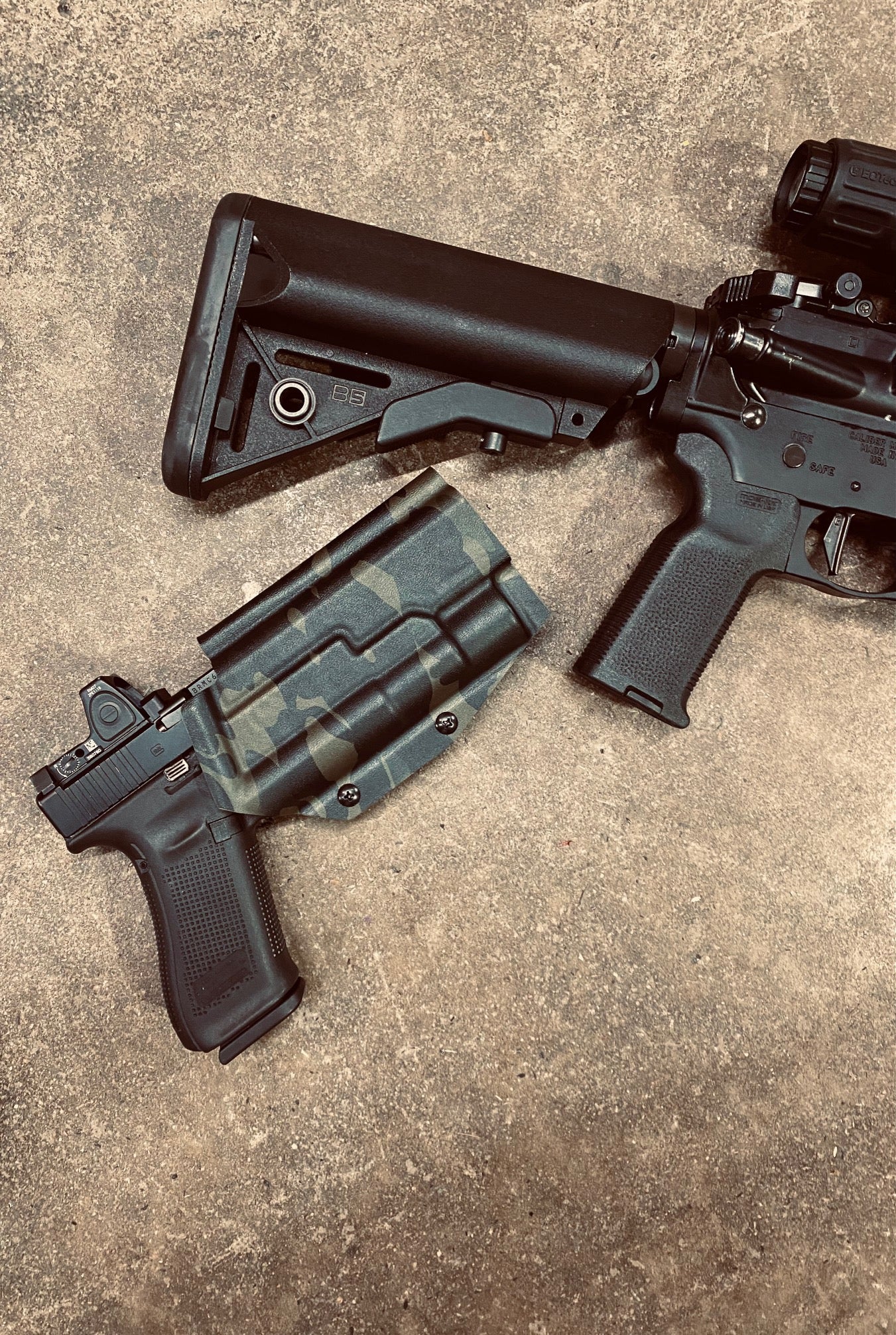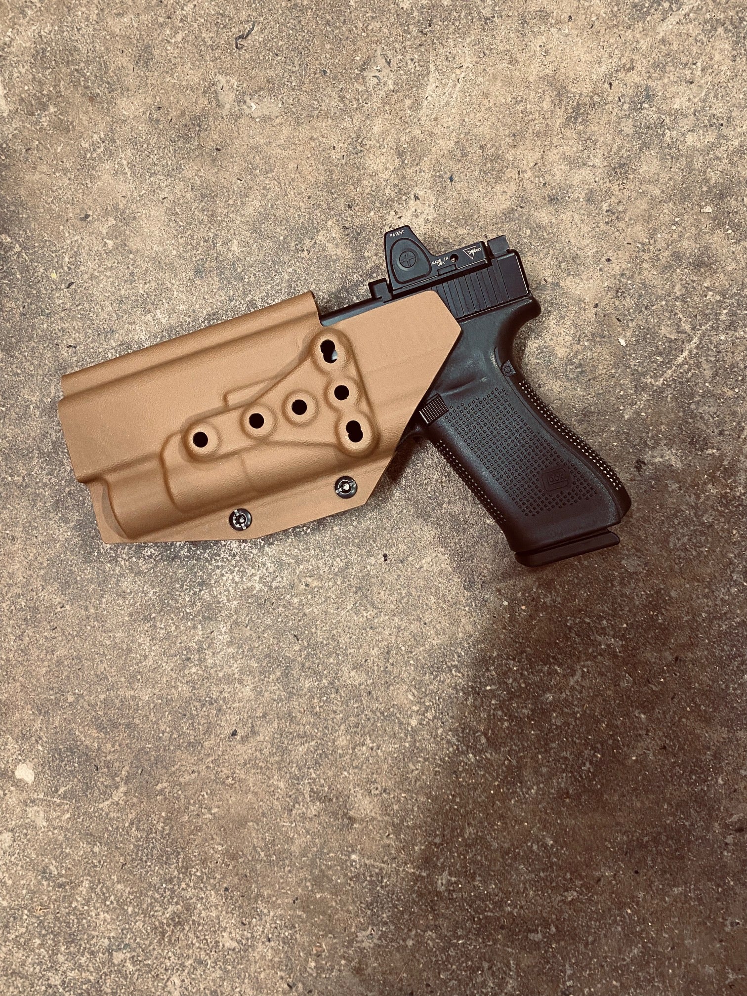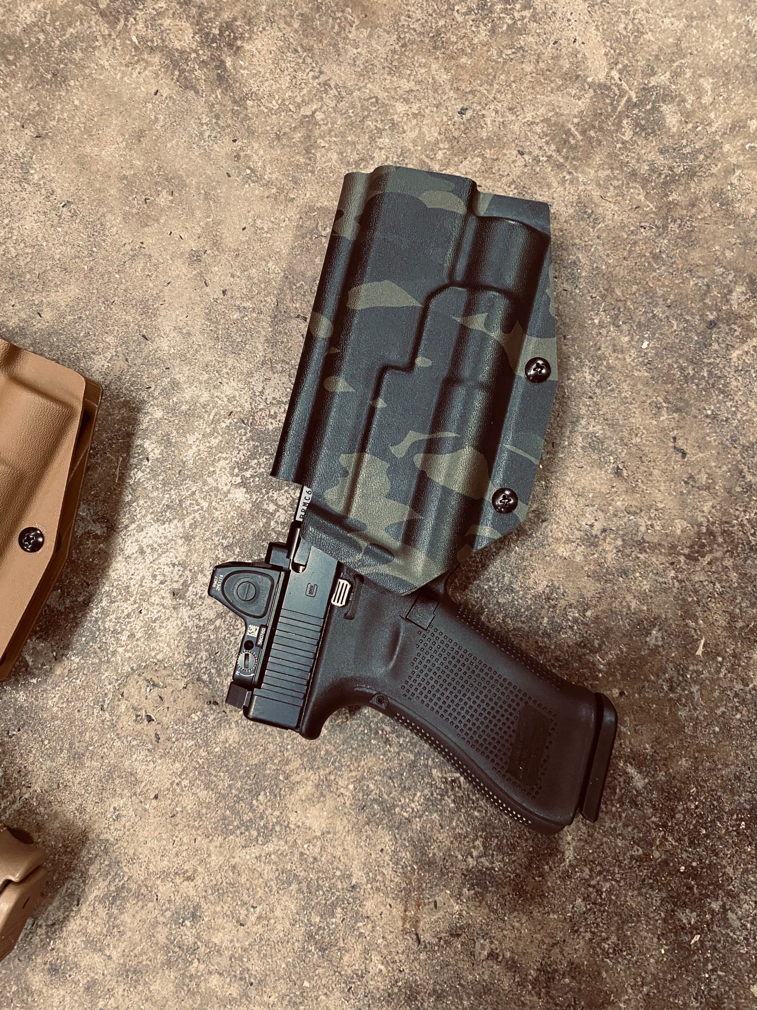The Sentinel 1 OWB (outside-the-waistband) holster was designed to be extremely modular, tough, modern. Made from a range of kydex .080 - 0.93 or heavy-duty .125 precision-formed Kydex . The Sentinel 1 is a passive-retention holster (no hood/strap/button to deactivate the holster), it features adjustable retention using screws along the edge of the holster. While not necessary for maintaining retention, all Sentinel 1 holsters can accommodate slide mounted optics, threaded barrels, suppressor height sights < .500″, and select compensators.