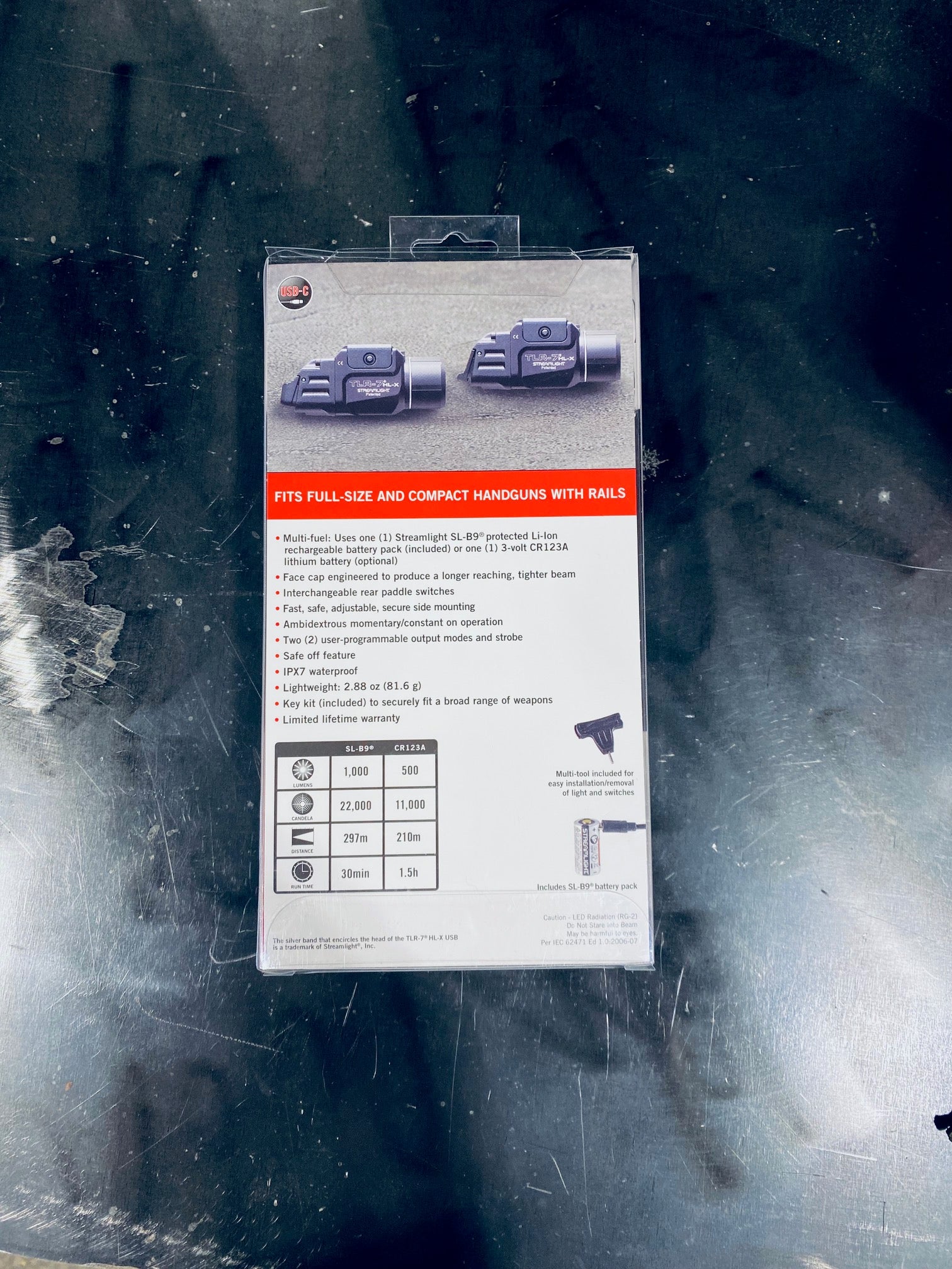 Part Numbers ListThe TLR-7® HL-X USB high-lumen, multi-fuel, rail-mounted light is engineered to produce a longer reaching, tighter beam. It accepts either Streamlight’s SL-B9® USB-C rechargeable protected lithium-ion battery pack or a single CR123A lithium battery. Interchangeable rear paddle switches accommodate your shooting style.